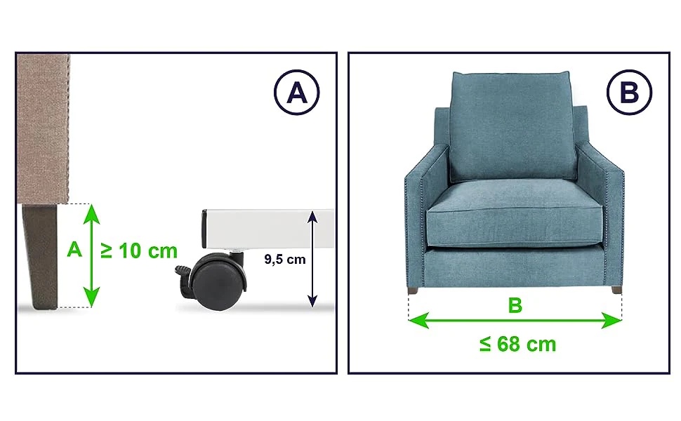Se la base della poltrona, della sedia a rotelle, del divano o del letto è maggiore o uguale a 10 cm, è possibile utilizzare il tavolino senza problemi.